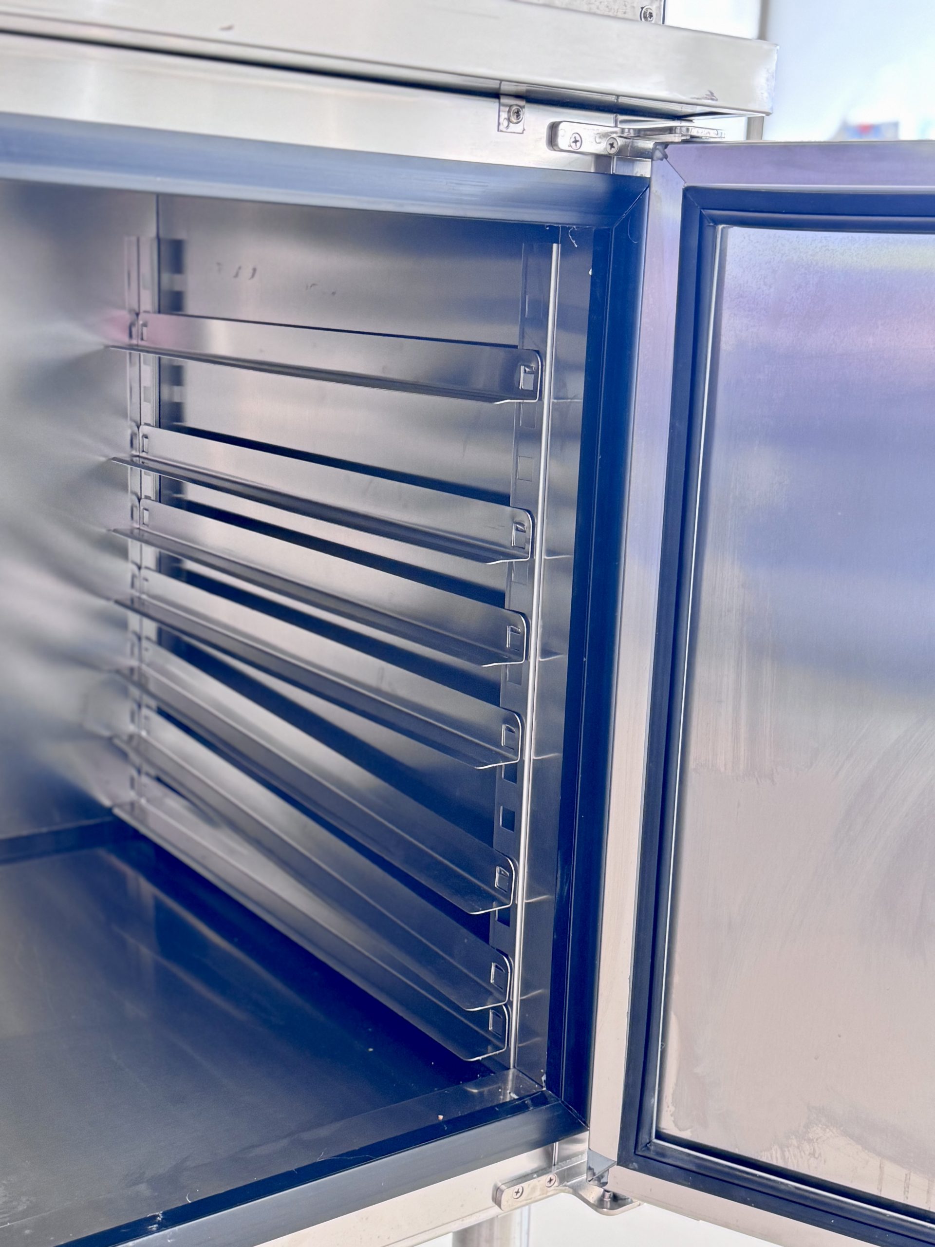 Le tour est équipé de 7 rangées de glissières par compartiment (selon configuration). L’espacement est optimisé pour plaques pâtissières standards (ex : 600×400 mm). Il est possible d’ajuster le nombre de niveaux selon la hauteur des préparations.